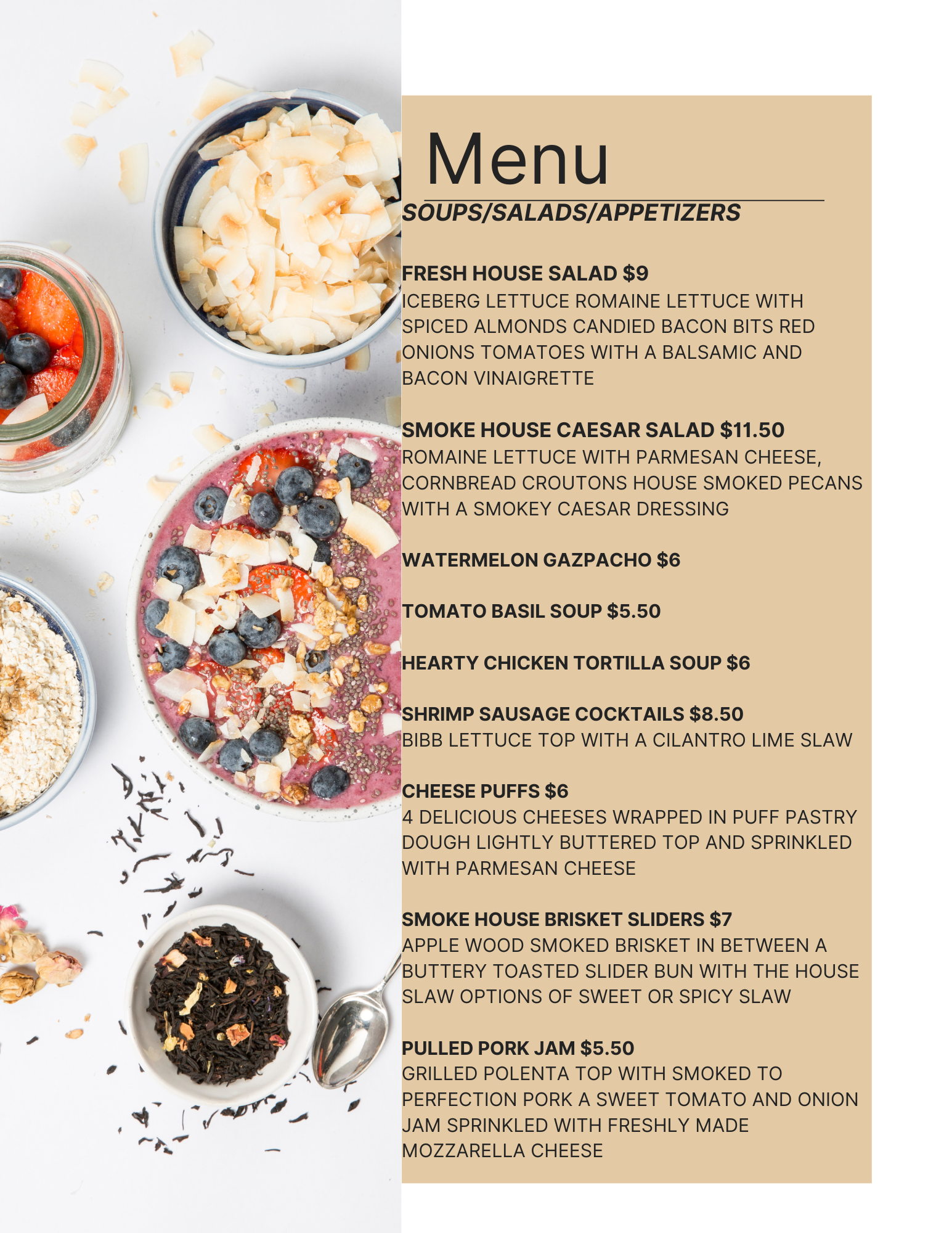 Includes Chef’s seasonal accompaniments and your choice of Two Desserts